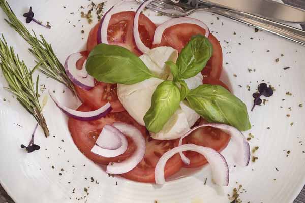 Caprese – Mozzarella mit Tomatenscheiben und frischem Basilikum11.90